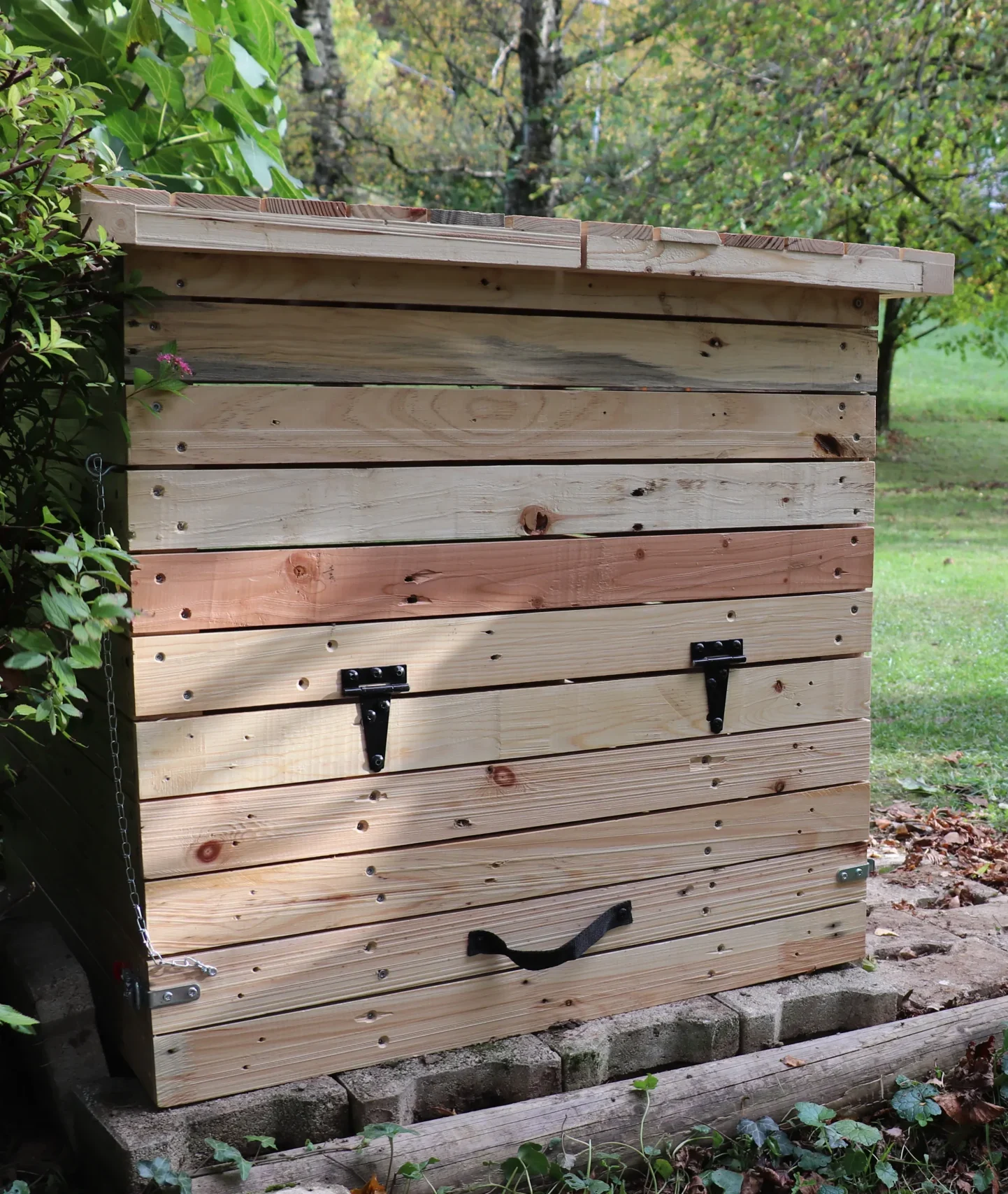 Nos composteurs sont fabriqués à partir de planches de palettes à usage unique. Le bois de ces palettes n’est pas traité chimiquement. Les planches sont assemblées avec des vis inox et de la colle à bois pour garantir une solidité.
